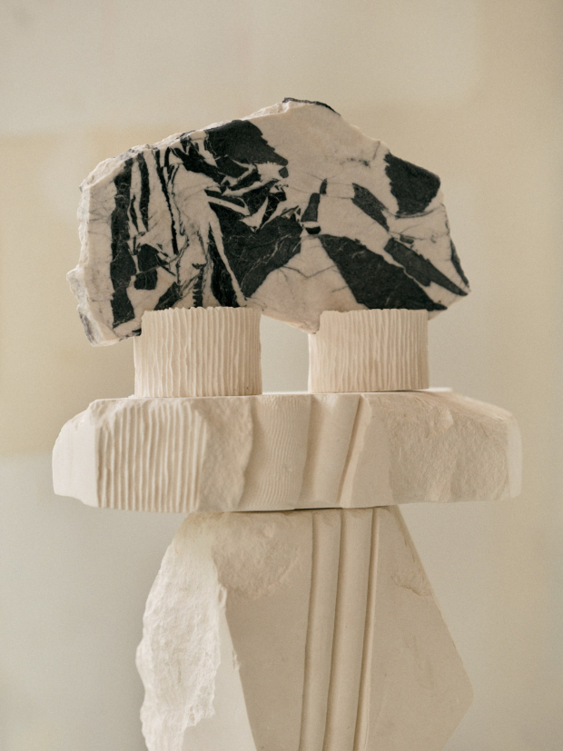 Audrey Guimard is a self-taught sculptor with a passion for stonework. Growing up in the mountains, surrounded by this material, has had a profound influence on her career. After studying art history and archaeology, she turned to museography, scenography and interior design, before discovering her true passion during an artistic residency in disused quarries. For the Sessùn flagship store in Paris, Audrey has designed a series of unique sculptures, ranging from seats to totems, as well as smaller pieces. Inspired by Sessùn's luminous, refined universe, she created works that interact with each other, celebrating natural materials and craftsmanship, while respecting the brand's timeless aesthetic.