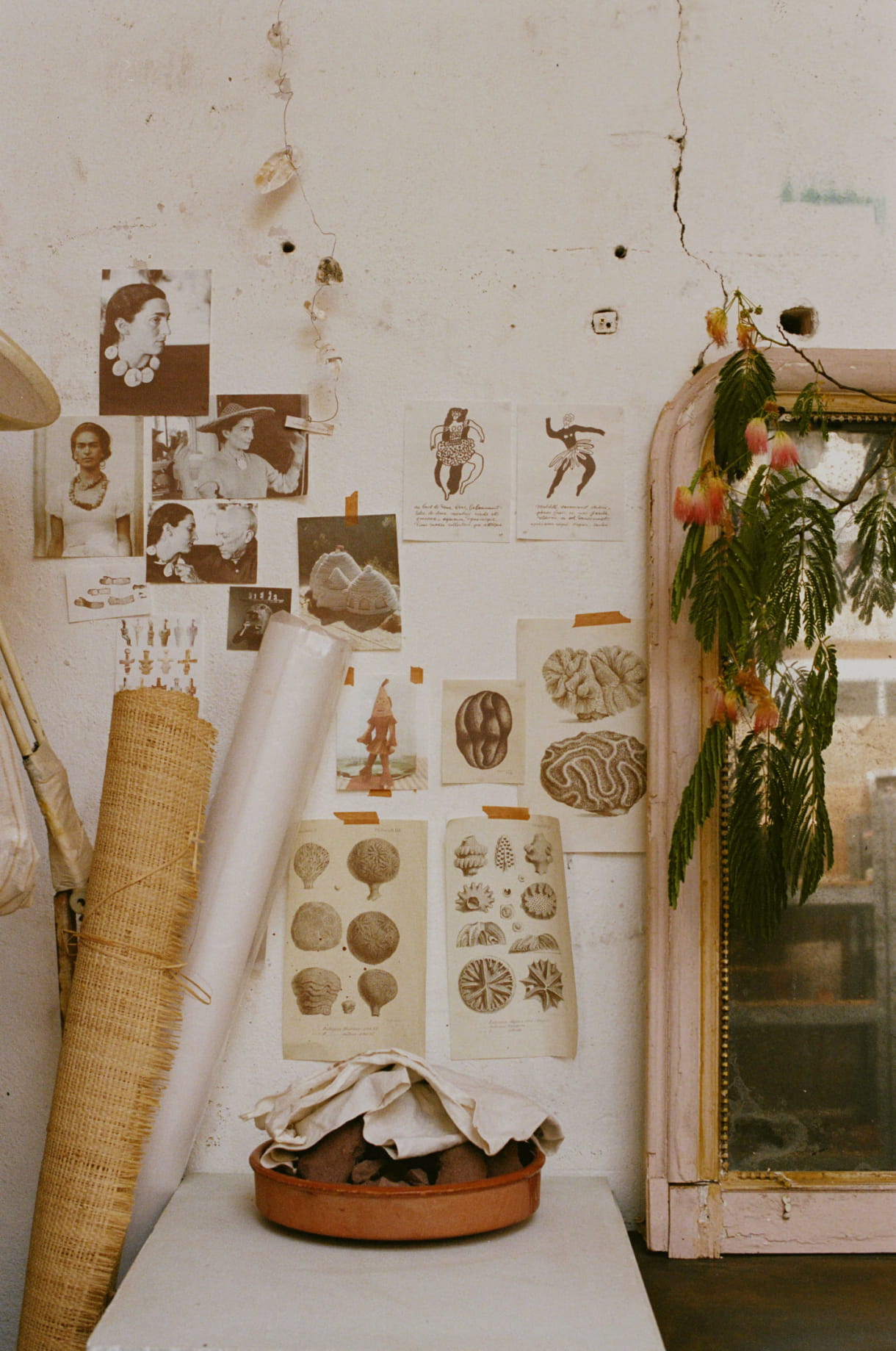 My studio is simple, small, modest. It suits me well. I love picking branches, hanging them above my workspace, and then watching them evolve over days. I don't have running water, and it turns out this is actually a blessing. What could have been a problem has become an advantage: I work with different water tanks, it's incredibly eco-friendly, and I'm very proud of it.