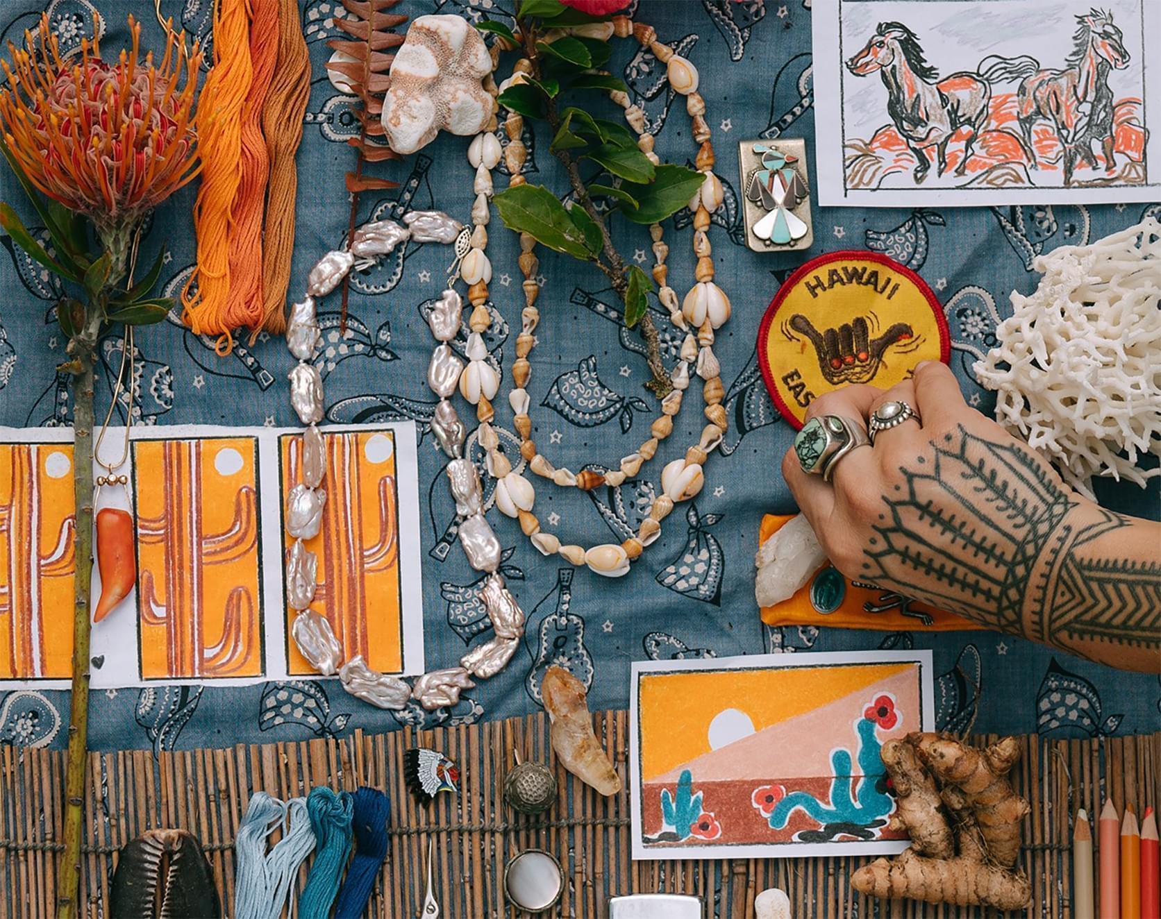 Born from the encounter of two travel and world art enthusiasts, the collaboration between Sessùn and Marie-Sophie Lockhart opens onto a universe of marked temperament, bathed in 70's inspirations and the great American West.